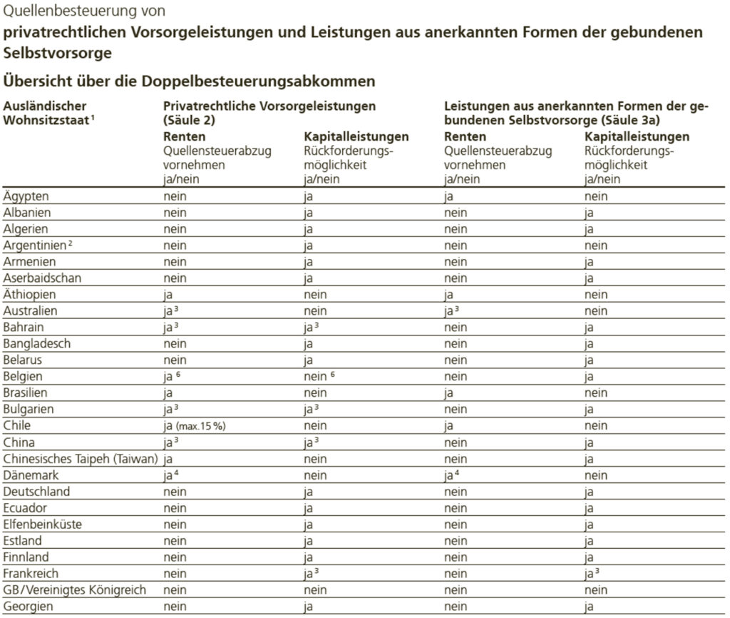 Bezieht eine in der Schweiz versicherte Person im Ausland Kapitalleistungen aus der zweiten Säule oder aus der Säule 3a, so unterliegt dieser Bezug grundsätzlich der schweizerischen Quellensteuer (QST). Diese ersetzt die inländische Kapitalauszahlungssteuer, die bei Wohnsitz in der Schweiz zur Anwendung käme. Wichtig ist, dass sich die Höhe der Quellensteuer nicht nach dem Wohnsitzstaat der bezugsberechtigten Person richtet, sondern nach dem Steuertarif jenes Kantons, in dem die zuständige Vorsorge- bzw. Freizügigkeitsstiftung ihren Sitz hat. In gewissen Fällen resultieren dadurch niedrigere Steuersätze als bei einem Kapitalbezug im Inland. Sofern zwischen der Schweiz und dem Wohnsitzstaat der betroffenen Person ein Doppelbesteuerungsabkommen (DBA) besteht, das dem Ansässigkeitsstaat das Besteuerungsrecht an der Kapitalleistung zuweist, besteht grundsätzlich die Möglichkeit, die in der Schweiz erhobene Quellensteuer zurückzufordern. Dies bedingt in der Regel ein entsprechendes Rückerstattungsverfahren bei der zuständigen Schweizer Steuerbehörde. Existiert kein DBA, kann hingegen keine Rückerstattung erfolgen, was im ungünstigsten Fall zu einer wirtschaftlichen Doppelbesteuerung führt, sofern der Wohnsitzstaat die Kapitalleistung ebenfalls der Besteuerung unterzieht. Wird die Quellensteuer auf Renten erhoben, kann die quellensteuerpflichtige Person die auf der Rentenleistung erhobenen Quellensteuern in der Regel bis zum 31. März des Folgejahres mittels entsprechenden Antragsformulars zurückfordern, wenn gemäss DBA das Besteuerungsrecht nicht der Schweiz, sondern dem Ansässigkeitsstaat zugewiesen ist. Das Antragsformular muss vollständig ausgefüllt und unterzeichnet eingereicht werden.