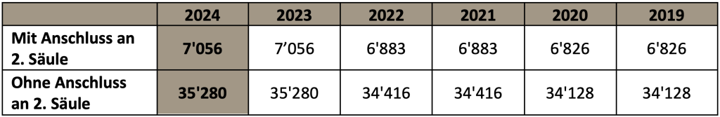 Der Bund hat letzte Woche die Maximalabzüge für das Jahr 2024 der gebundenen Vorsorge 3a bekannt gegeben. Auch im nächsten Jahr liegt dieser für Personen mit Anschluss an eine Pensionskasse bei CHF 7’056.- und für Personen ohne Anschluss bei CHF 35’280.- oder 20% des Nettojahreseinkommens.