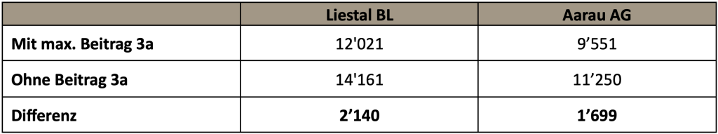 In der Regel wird für die 3a besonders mit den jährlichen Steuerersparnissen geworben. Nachfolgend ein kurzes Beispiel; Person ist männlich, alleinstehend, Nettoeinkommen CHF 80’000.- pro Jahr und konfessionslos. Berücksichtigt sind die kantonalen üblichen Abzüge.