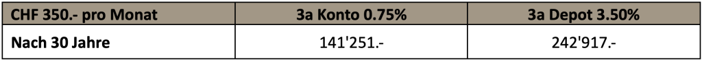 Wenn man früh mit dem Sparen beginnt, bietet sich durch den langen Anlagehorizont die Möglichkeit, diese 3a Gelder nicht nur auf das Konto einzuzahlen, welches oftmals zu einem tiefen Satz verzinst wird, sondern in einem Anlagegefäss zu investieren.