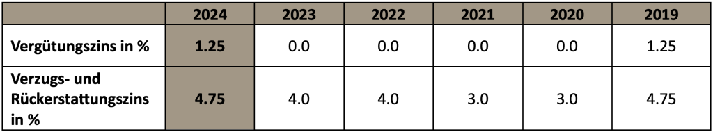 Die Zinssatzverordnung des Bundes sieht vor, dass die Zinssätze im Bereich der Bundessteuern jährlich überprüft werden, um sie bei Bedarf an das aktuelle Zinsniveau anzupassen. Ab dem 1. Januar 2024 werden der Verzugszinssatz und der Vergütungszinssatz für Rückerstattungen aufgrund gestiegener Zinsen auf 4,75% angehoben, was einer Erhöhung von 0,75% gegenüber den bisherigen 4% entspricht. Der Vergütungszinssatz für freiwillige Vorauszahlungen bei der direkten Bundessteuer steigt auf 1,25%, im Gegensatz zu den bisherigen 0 Prozent.